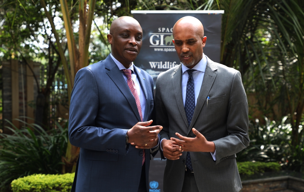 Minister for Justice and Attorney General, Emmanuel Ugirashebuja (R) interacts with Prosecutor General Aimable Havugiyaremye as NPPA  validated the Rapid Reference Guide, a tool that will help regulate environmental crimes on December 1. Photo by Craish Bahizi