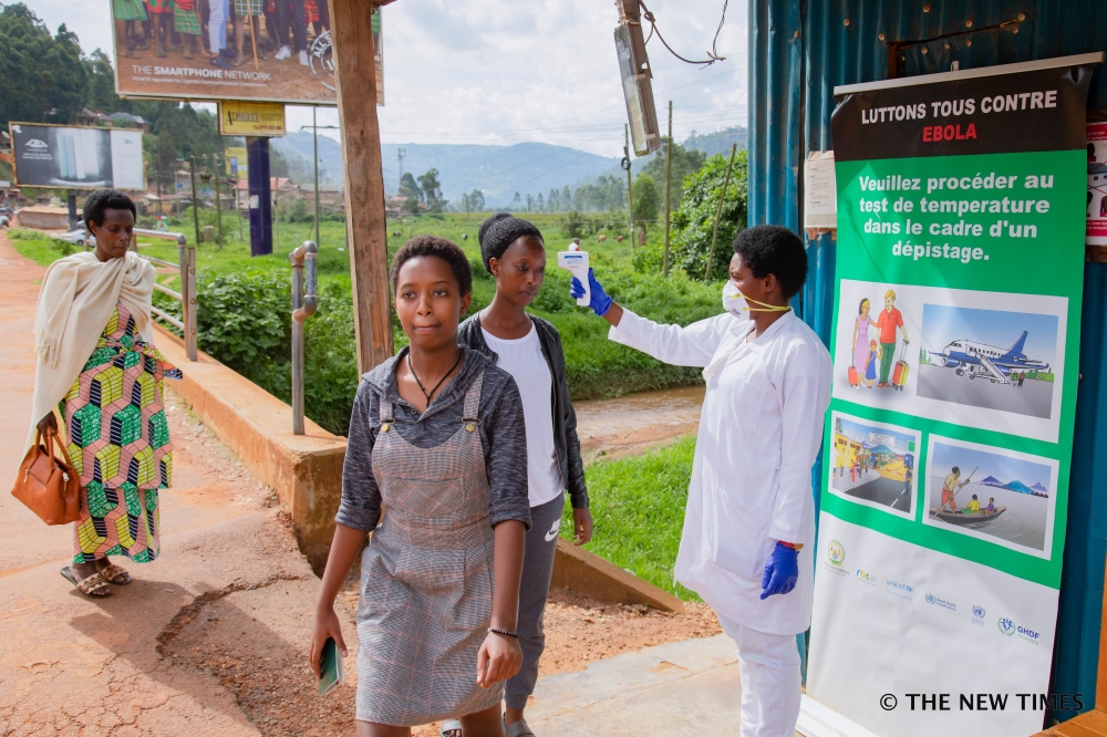 A health worker during temperature screening at Gatuna One-Stop Border Post on May 27, 2019. Rwanda has taken fresh measures to prevent Ebola virus from spilling over into the country from Uganda. / File