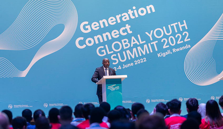 Prime Minister Edouard Ngirente delivers remarks at the Generation Connect Global Youth Summit in Kigali on June 2,2022. Courtesy