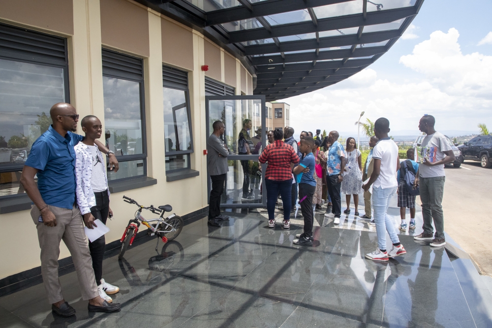 Olivier Brave Ngabo, Permanent Secretary at the Ministry of Youth and Arts and Carine Umutoni, Ecobank Rwanda Managing Director speak to youths as  Ecobank Rwanda donated computers to youth centres under the Ministry of Youth and Arts. All photos by Kellya Keza