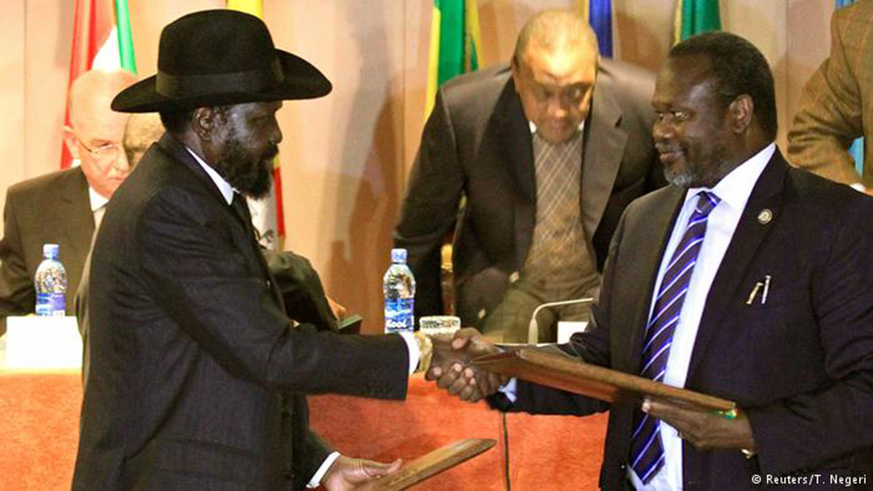 South Sudan President Salva Kiir and rebel leader Riek Machar shake hands.