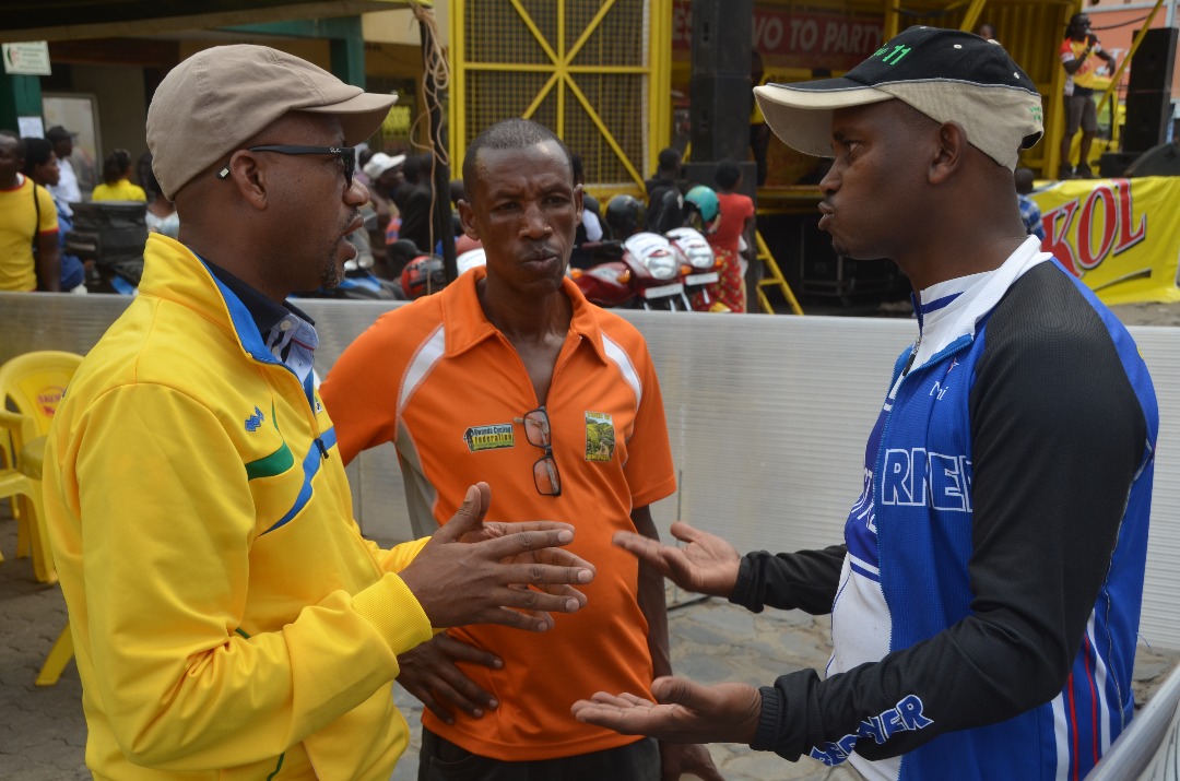 Jean Baptiste Rugambwa (C) chats with Ferwacy president Aimable Bayingana (L) and vice president (R) Benoit Munyankindi during a past Rwanda Cycling Cup race. Sam Ngendahimana